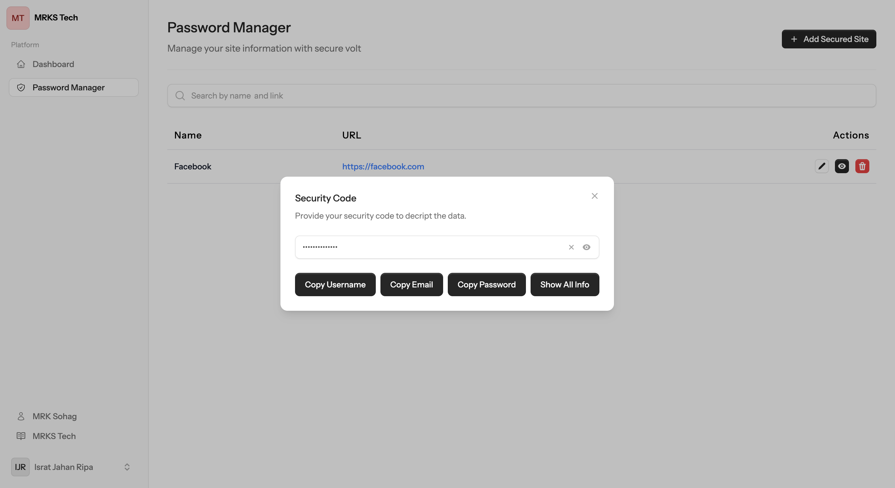 No one will know your password except you, as we do not store it. It is crucial not to forget your security code. If you lose this code, you will be unable to access your site passwords, as the data is securely encrypted and cannot be retrieved without it.